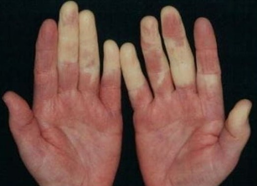 색깔 변화 : 손가락이나 발가락이 하얗게 변한 후, 파란색으로 변하고, 마지막으로 붉은색으로 돌아오는 과정은 레이노 증후군의 전형적인 증상입니다. 이 색깔 변화는 혈액 공급이 차단되었다가 다시 회복되는 과정을 반영합니다. 하얗게 변할 때는 혈액이 차단되어 산소 공급이 부족해지고, 파란색으로 변할 때는 혈액이 다시 공급되면서 나타나는 현상입니다. 마지막으로 붉은색으로 돌아오는 것은 혈액 순환이 회복되면서 발생합니다.